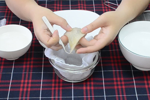 Bước 3: Tách tổ yến ra thành từng sợi sau đó cho yến vào rây, đặt rây vào thau nước, dùng muỗng khuấy nhẹ, nhấc rây lên xuống. Lông tơ yến sẽ theo nước ra ngoài, thay nước nhiều lần ta sẽ có yến sạch.